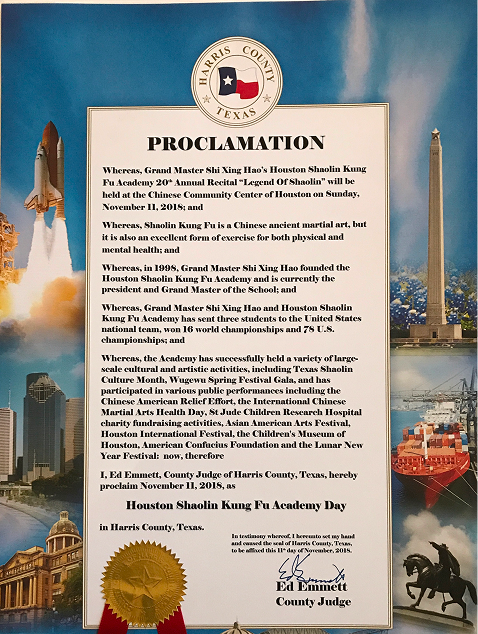 Based on the outstanding contribution of the Academy to Sino-US cultural and sports exchanges, President George H.W. Bush and Congressman Al Green, Congressman Sheila Jackson Lee, Congressman Nick Lampson, Texas Governor Rick Perry, Texas State Senator Gene Wu, Houston Mayors Bill White and Annice Parker, and Sylvester Turner all have given many awards and honorary certificates to Master Shi Xing Hao and the Houston Shaolin Kungfu Academy.